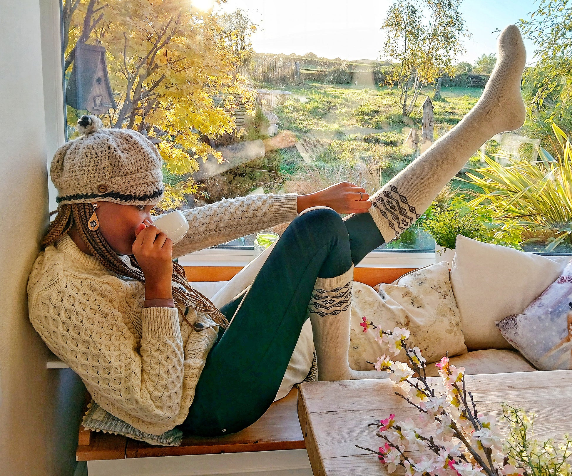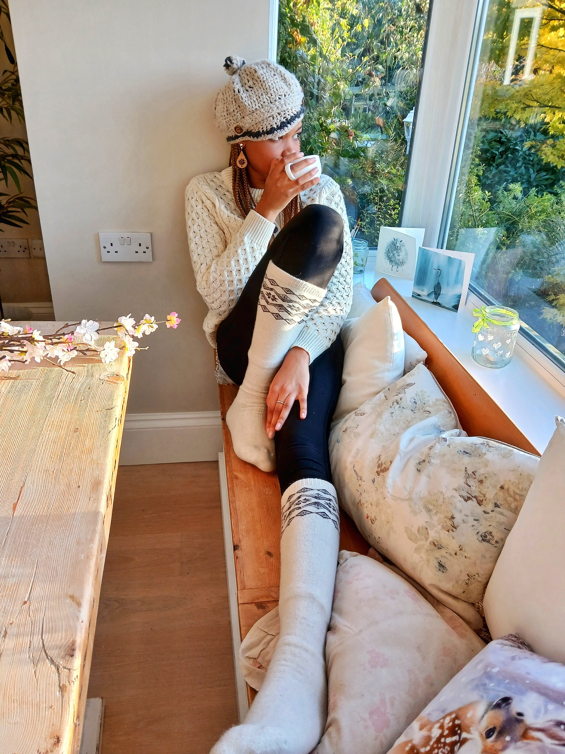 Our sheep's wool thigh-high socks come in two sizes and features a comfortable fit. The sheep's wool material is great at keeping you warm. This sock sits approximately 21" above the shoe. 70% sheep's wool. Made in Mongolia