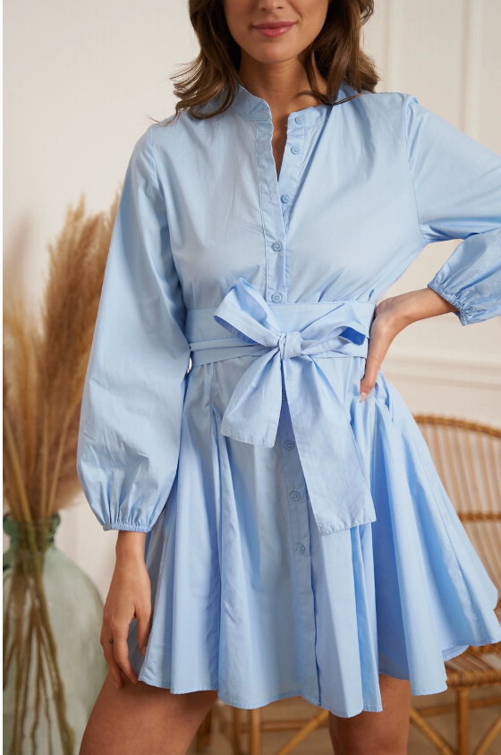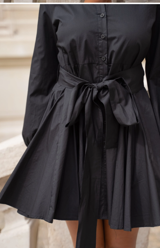 Cotton dress, flared cut with ruffles, long sleeves, belted at the waist. When worn, it has a very nice volume and does not go unnoticed. Length: 90cm