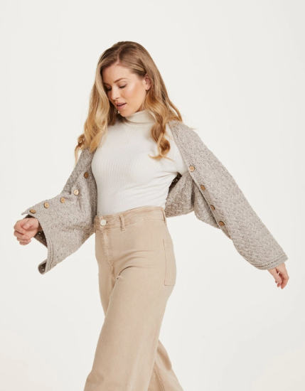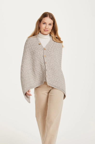 Innovative, multi-functioning and sustainably crafted. Sustainability is at the heart of our knitwear here at Aran Woollen Mills, and the Glenbeigh Aran Cape takes cost-per-wear to the next level. This cleverly designed piece can be worn in three ways, depending on the buttoning.
